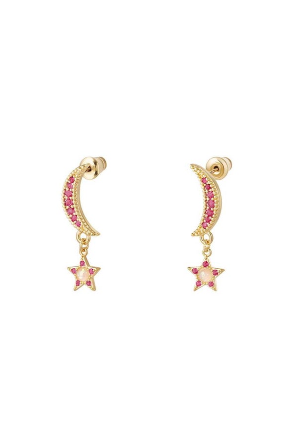 Schattige gouden oorbellen met een hangertje in de vorm van een maantje met een sterretje. De oorbellen zijn gemaakt van gold plated koper. Deze sparkle oorbellen zijn ingelegd met kleine zirkonia steentjes in de kleur wit. De oorbellen zijn 2.9 cm lang en 0.8 cm breed. De oorbellen wegen 2.2 gram.