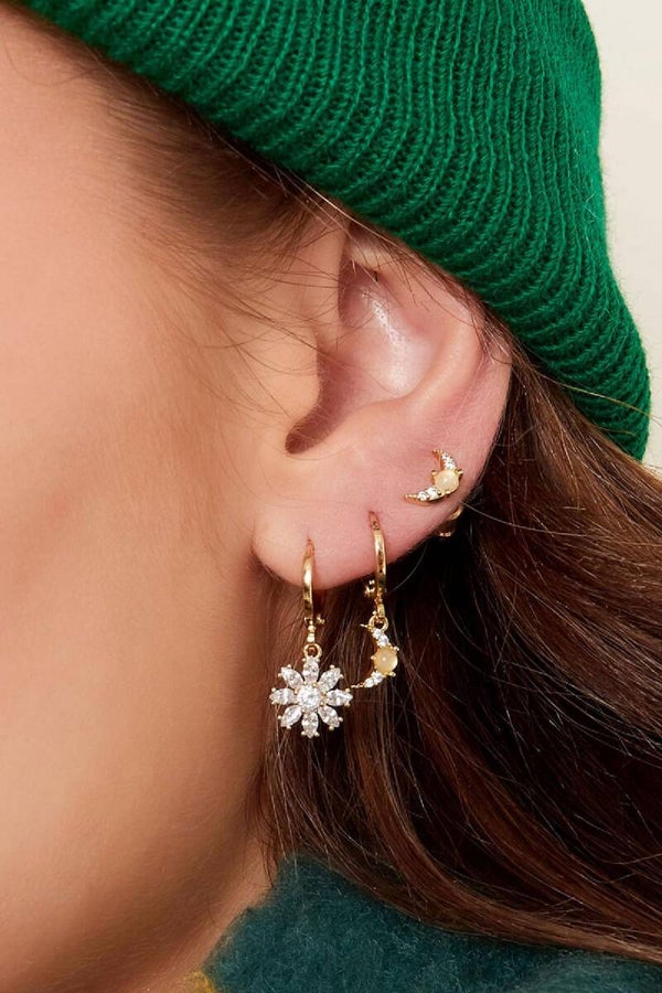 Schattige gouden oorbellen met een hangertje in de vorm van een klein maantje. De oorbellen zijn gemaakt van gold plated koper. Deze sparkle oorbellen zijn ingelegd met kleine zirkonia steentjes in de kleur wit. De oorbellen zijn 2.3 cm lang en 1.2 cm breed. De oorbellen wegen 3.2 gram.
