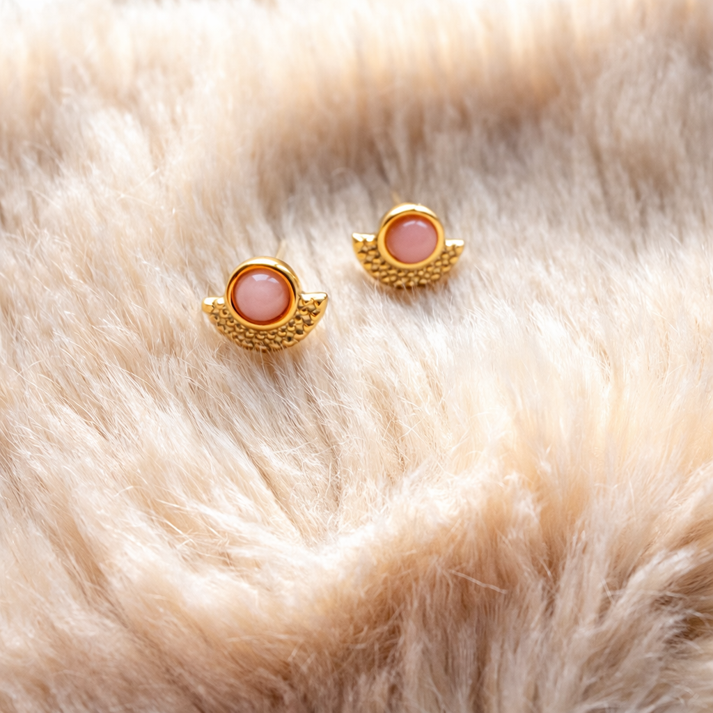 Deze prachtige studs zijn de perfecte combinatie van zacht en speels. Het warme goudkleurige design met subtiele bolletjesdetails omlijst een lieve roze steen, een echte eyecatcher die toch elegant blijft. Draag ze solo voor een minimalistische look of combineer ze met meerdere oorbellen voor een trendy earparty.