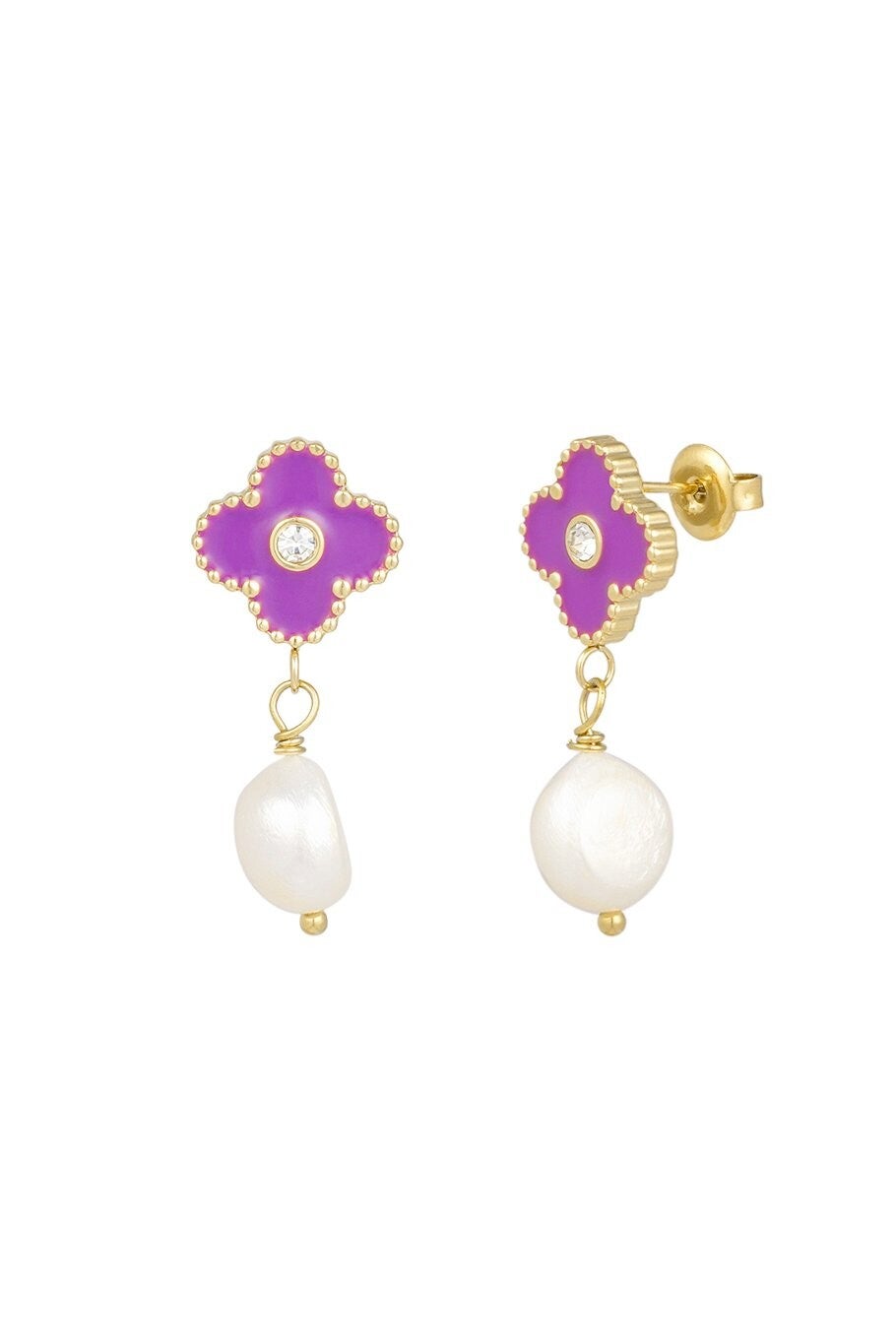 eze oorbellen combineren speelse elegantie met een vleugje luxe. De goudkleurige studs met paarse clover details en een subtiel steentje stralen pure vrolijkheid uit, terwijl het witte parelhangerje zorgt voor een classy finishing touch. Ideaal voor wie houdt van kleur én verfijning.