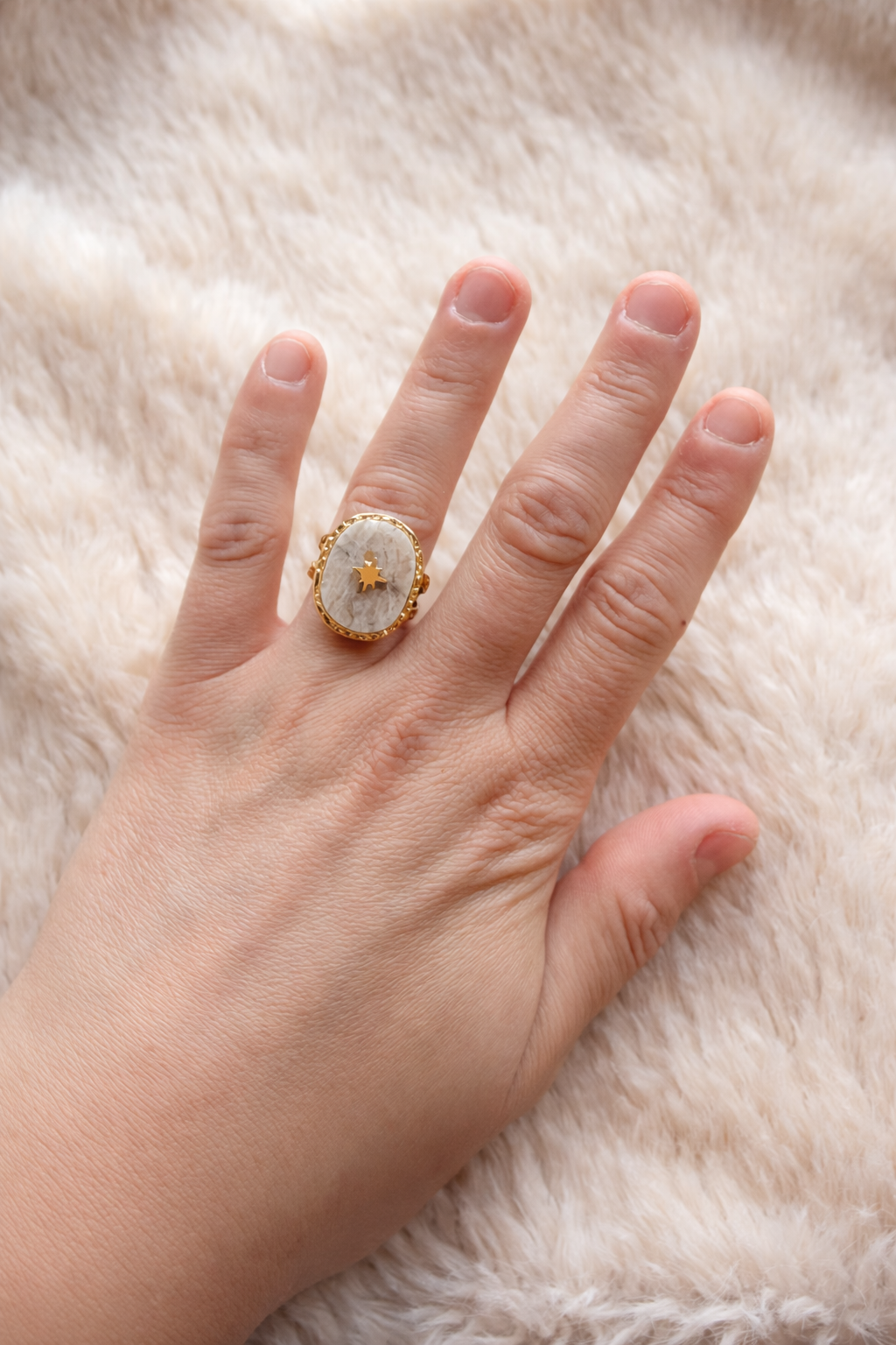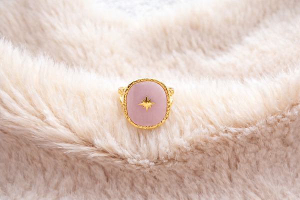 Elegante ring met sterdetail. Deze stijlvolle ring met zachte roze steen en subtiel sterdetail geeft elke look een unieke en elegante touch. Perfect om solo te dragen of te combineren met andere ringen.